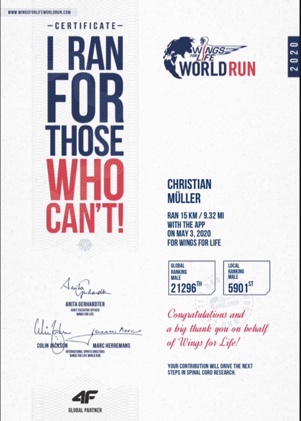 Wir sollten uns wieder etwas mehr damit beschäftigen, wie es uns geht, was wir alles machen können. Was ist diese Corona-Krise? Eine Einschränkung. Man darf sich nicht mit mehreren anderen Menschen treffen, nicht feiern, essen gehen, zusammen sein. Aber wir können alles machen, stehen morgens auf und sind zumindest körperlich weitgehend gesund. Also können aufstehen, spazieren gehen und uns momentan an der Familienidylle im heimischen Raum erfreuen. Das gerät immer mal wieder in Vergessenheit. Herr Müller schaute am Sonntag morgen im Internet und fand zufällig den Wingsforlife Worldrun. Es ist ein Lauf, der zeitgleich auf der ganzen Welt stattfindet. Start ist um 13.00 Uhr. Da natürlich in dieser Situation kein Lauf stattfinden kann, gibt es eine App, mit der jeder an jedem Ort der Welt mitlaufen kann. Es gibt kein Ziel, aber ein Catcher-Car, das 30 Minuten nach dem Start losfährt und einen irgendwann einholt. Dann ist das Rennen beendet. Die startgebühr geht zu 100% an die Rückenmarksforschung. Herr Müller erinnert sich, dass er ja schon 2014 und 2015 bei diesem Lauf teilgenommen hat, damals noch in Darmstadt. Nach längerem hadern beschließt er, sich die App herunter zu laden und mitzulaufen. Also gut, um 13.00 h ist Start und er läuft los. Sein Ziel setzt er sich mit 10 km, die ist er schon seit 2015 nicht mehr gelaufen. Es läuft super, nach genau 15 km erreicht ihn das virtuelle Catcher-Car. Alle sind stolz und zufrieden, es hätte niemand damit gerechnet. Dass es damals immer um die 30 km waren ist total unwichtig. Es war die richtige Entscheidung. Lauf für die, die nicht laufen können. 77103 Menschen nahmen weltweit teil und über 2,8 Millionen Euro wurden dadurch gespendet.