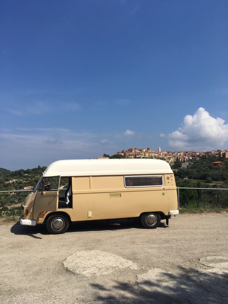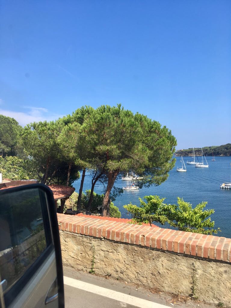 Spontaner Entschluss bis zum Hafen Pombione durch die Toskana zu brettern . Mo war in Höchstform!Ein paar Schweizer hatten uns erzählt : fahrt nach Elba , weißer Sand , türkisfarbenes Meer und nur eine Stunde Fähre . Klingt so weit verlockend !
