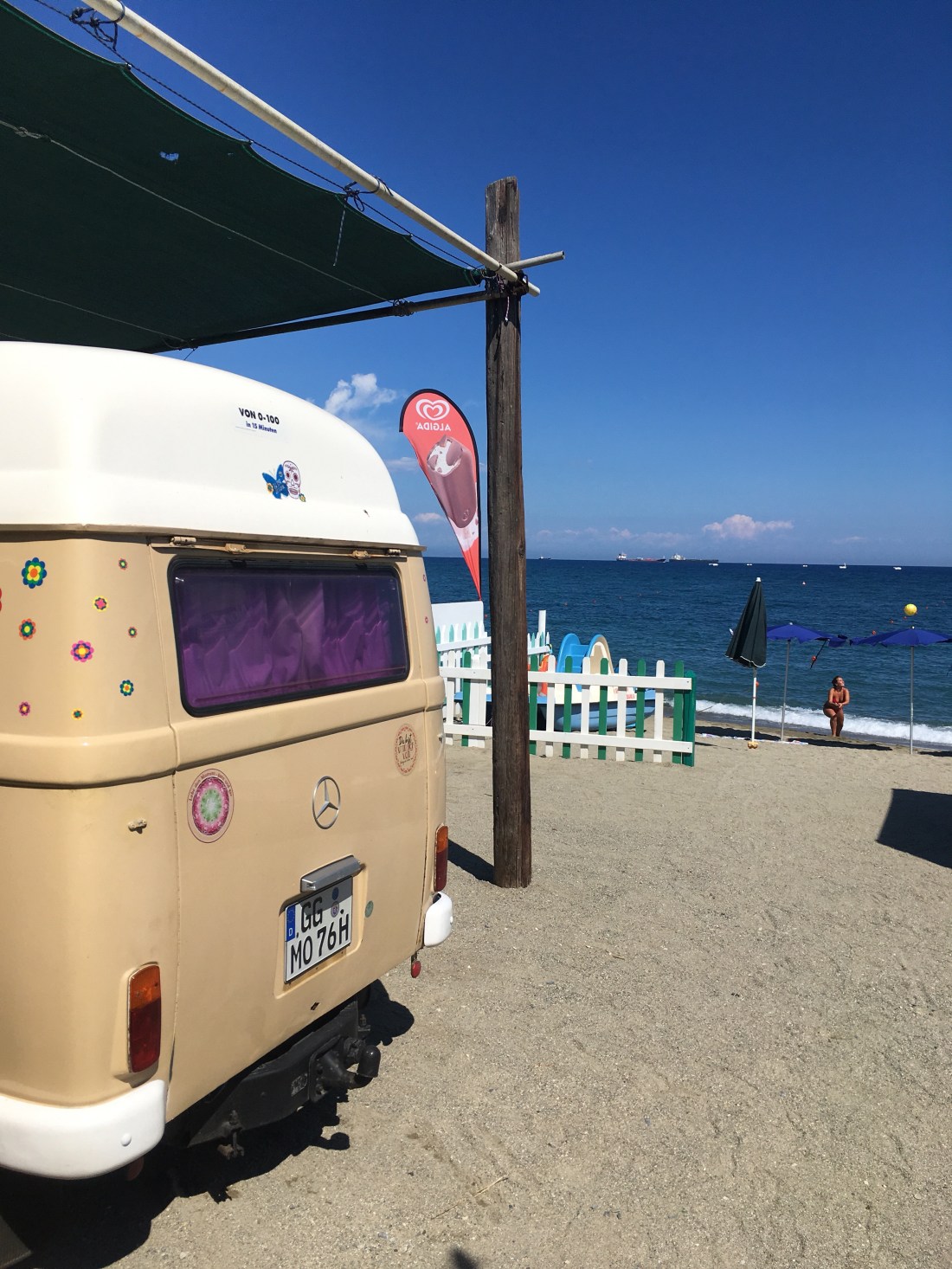 Irgendwas stört uns. Ist der Platz zu dunkel , zu leer, der Strand zu voll, das Meer zu steinig ? Kein Lüftchen geht , gefühlte 100 Grad im Mo. Kein schlaf , keine gute Laune. Weg hier .