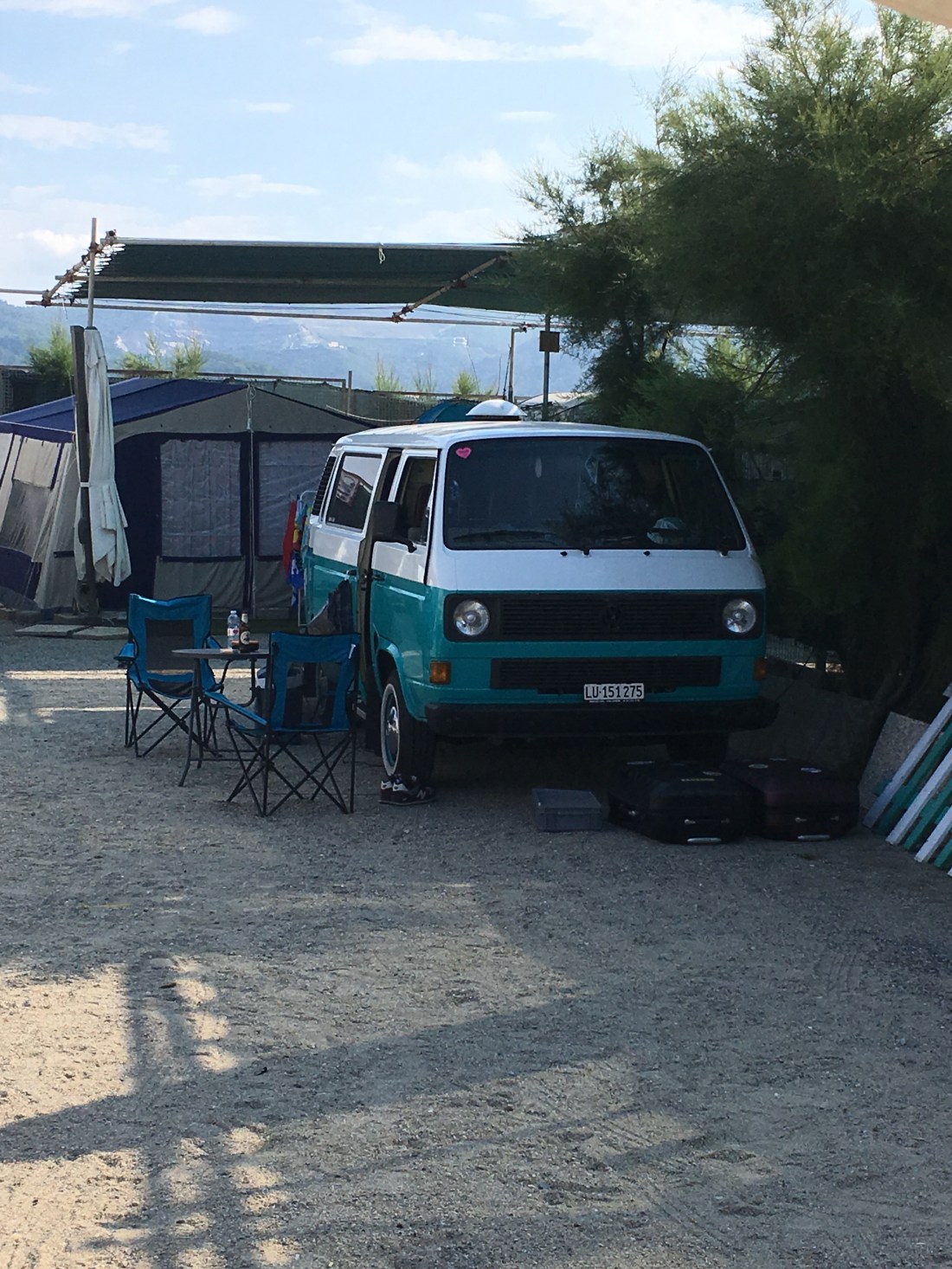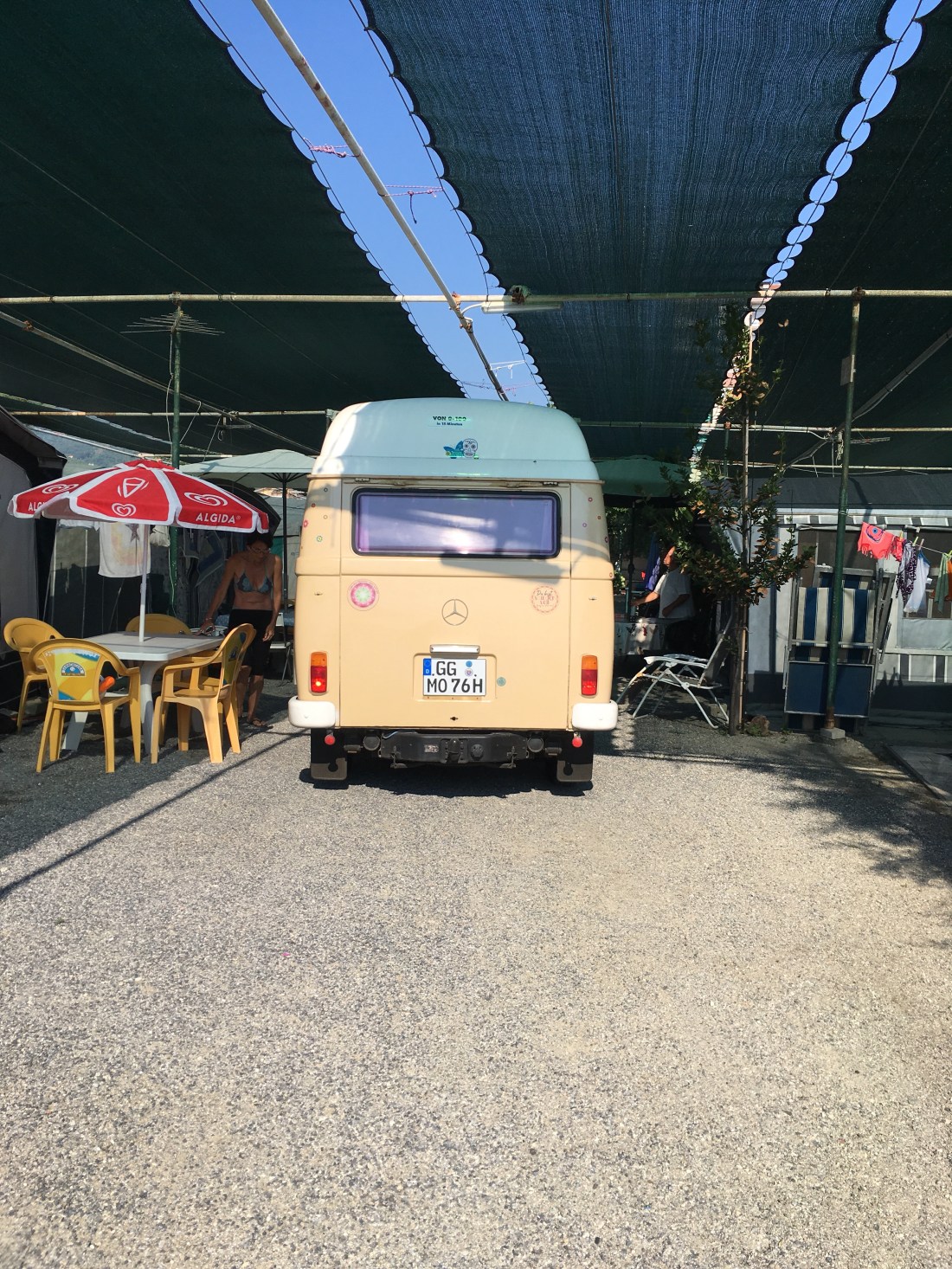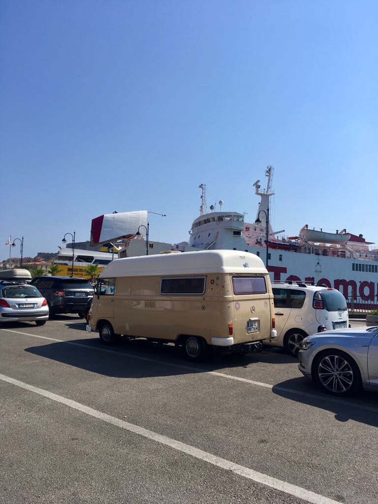Vom Osten der Insel quer durch in den Westen. Natürlich über den höchsten Berg ( mit 20-30 km/h. ). Ein Platz, 2 freie Stellplätze. Sandstrand, aber : RIMINI !!!! Ist schon cool, wie Mimi dem Luigi sagt, das gefällt uns nicht. Hauptsaison, Wochenende, nichts gebucht, wahrscheinlich sind wir die einzigen mit einem one-way Fähre Ticket.