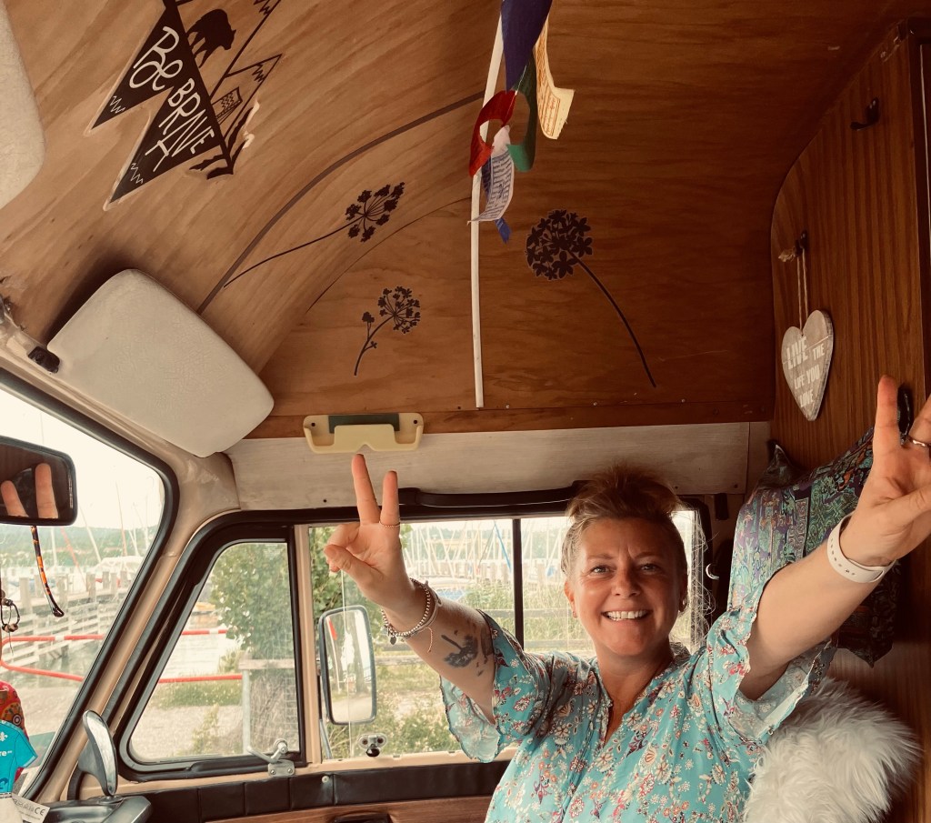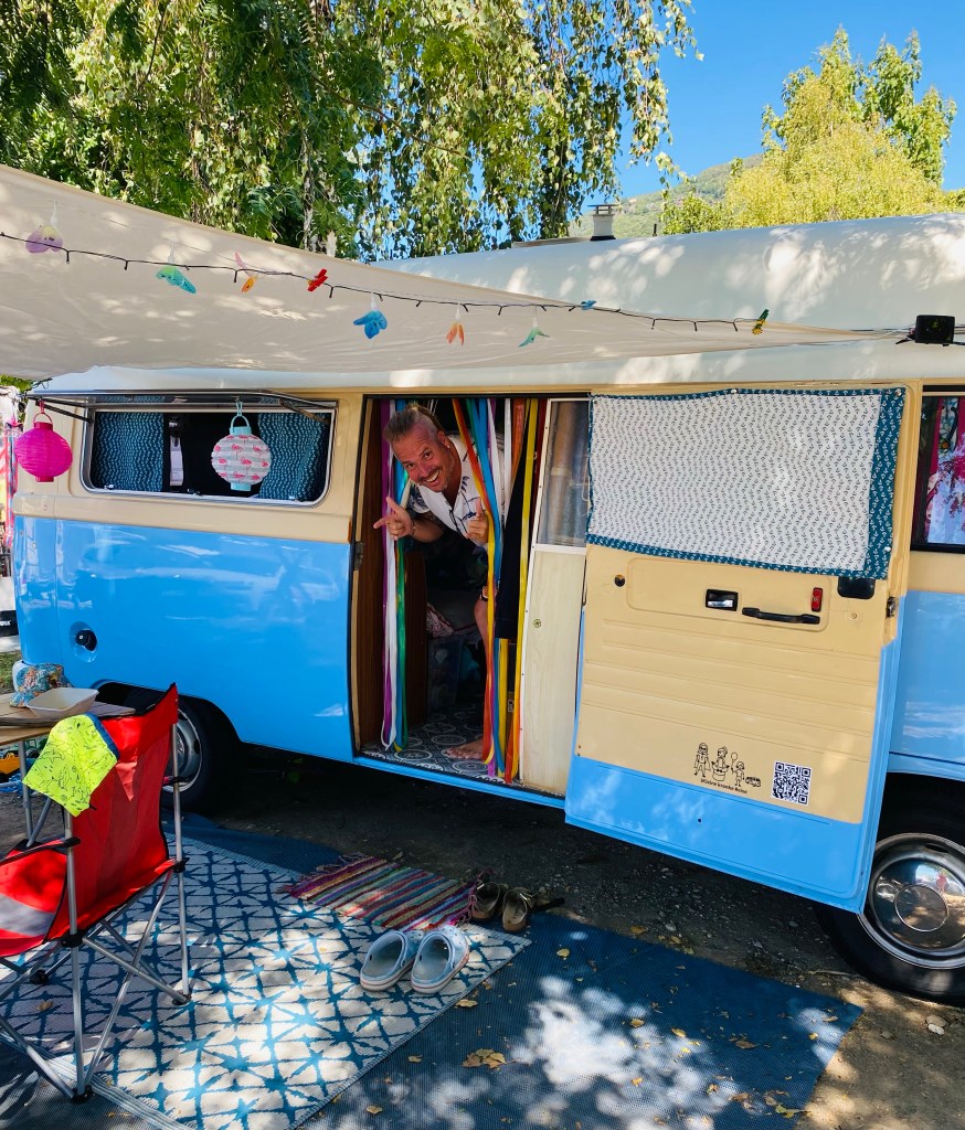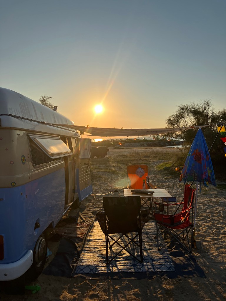 Jetzt liegen wir hier am Strand , der Bus direkt am Meer in der ersten Reihe .