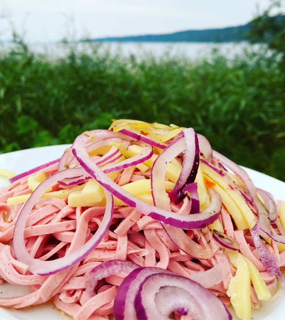 Eddie tobt mit anderen kids, wir genießen unseren Wurstsalat.